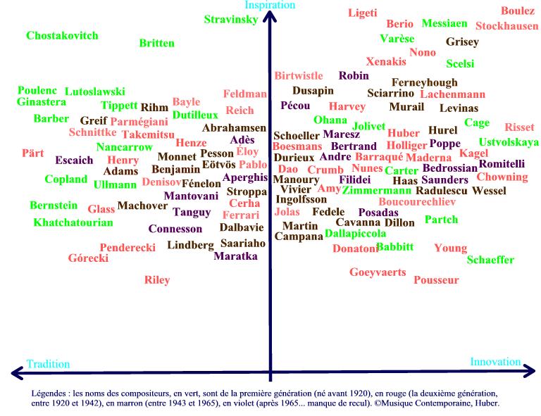 De toutes façons, toutes les œuvres sélectionnées ici dans la Base de données, et leurs compositeurs, sont de grande valeur : par exemple, pour le compositeur ici placé en bas à gauche, ce n'est nullement déshonorant… d'autres dimensions décrivent mieux sa démarche créatrice… et puis, beaucoup d'autres (des milliers) compositeurs ne figurent pas dans ce tableau.